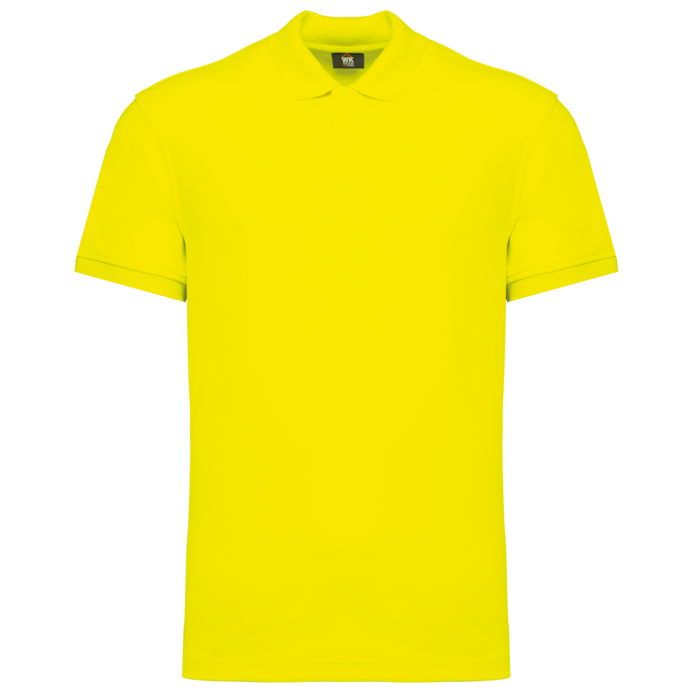 Nachhaltiges Unisex-Poloshirt aus Bio-Baumwolle & Recycling-Polyester in Fluor-Gelb oder -Orange, ideal für Arbeit und Events mit hoher Sichtbarkeit.