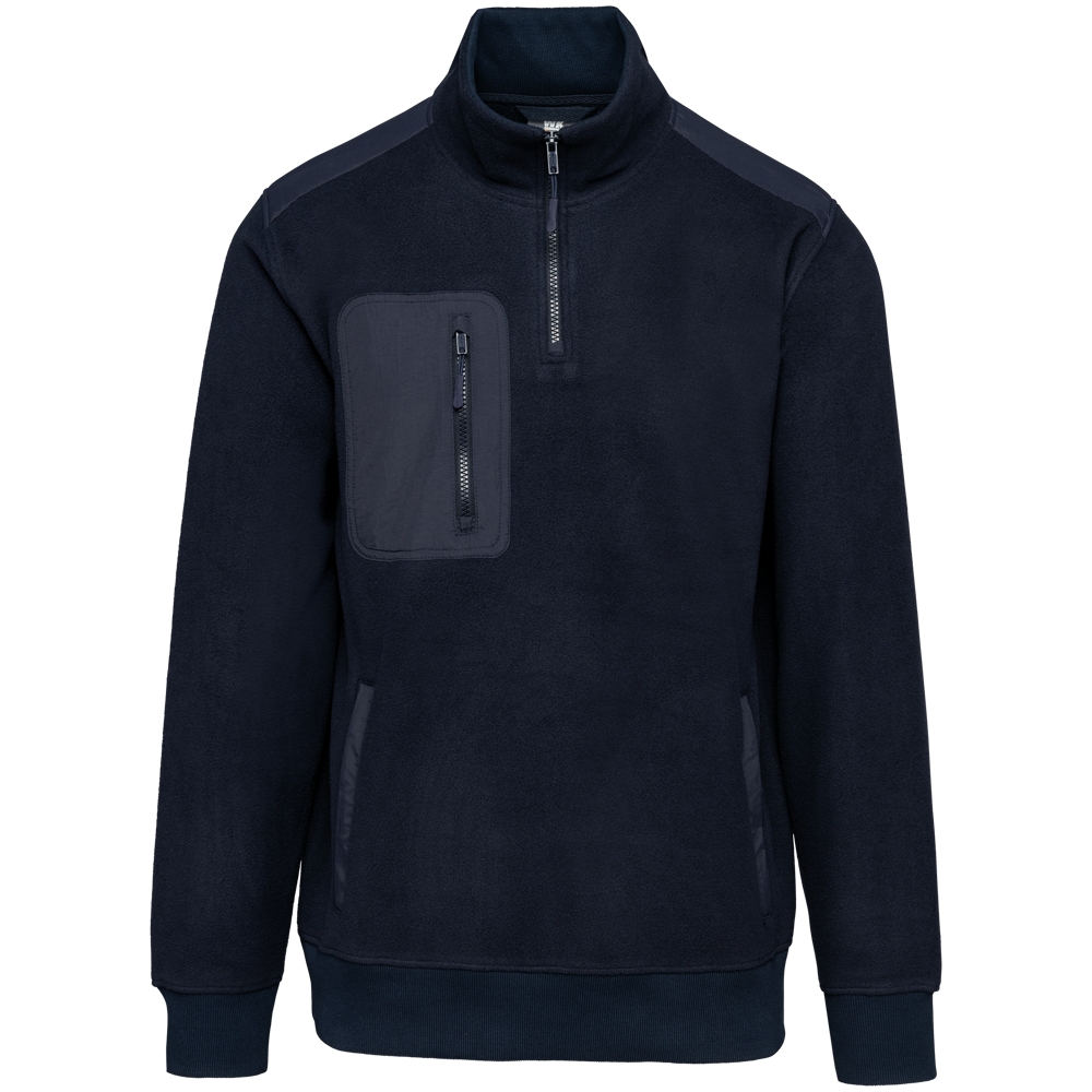 Die Jacke ist aus 100 % recyceltem Polyester hergestellt. Sie verfügt über einen Kragen mit einem Reißverschluss aus recyceltem Kunststoff. Die Passform ist gerade und für Damen und Herren (Unisex) geeignet. Das Fleece besitzt zwei Reißverschluss-Einschubtaschen vorne. Eine abgerundete Brusttasche mit Reißverschluss bietet zusätzlichen Stauraum. Schultern und Unterarme sind mit Taslan-Einsätzen verstärkt. Die Ärmelenden und der Saum sind mit einem 2x2 Rippstrickbündchen versehen. Das Produkt ist in den Größen XS bis 5XL und verschiedenen Farben wie Navy und Black erhältlich.