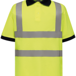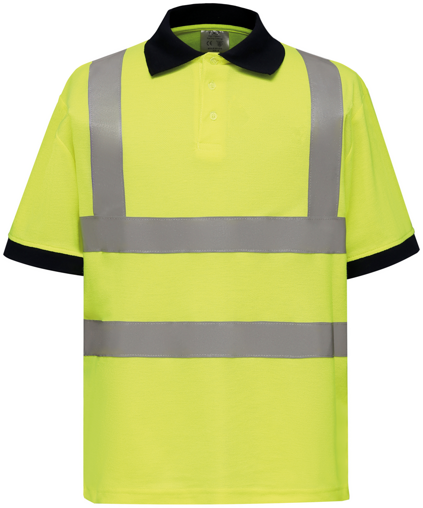 Das Material besteht zu 100% aus strapazierfähigem Polyester. Es verfügt über zwei umlaufende, 5 cm breite 3M-Reflektorstreifen. Diese befinden sich am Körper und über den Schultern. Kragen und Ärmelbündchen sind in kontrastierendem Navy gehalten. Das Poloshirt besitzt eine Knopfleiste mit drei Knöpfen. Doppelte Nähte sorgen für eine erhöhte Haltbarkeit. Es erfüllt die Norm EN ISO 20471:2013, Klasse 2.