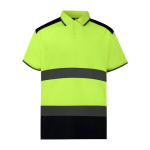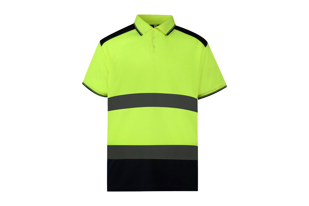 Das Material besteht zu 100% aus Polyester. Es ist ein flexibles und formstabiles Tricot-Gewebe. Das Polohemd verfügt über zwei sehr breite umlaufende Reflexstreifen. Es entspricht der Norm EN ISO 20471:2013 der Klasse 2. Es besitzt dunkelblaue Kontrastbereiche an Schultern, Kragen, Bündchen und Saum. Eine Knopfleiste mit drei Knöpfen sorgt für Tragekomfort.