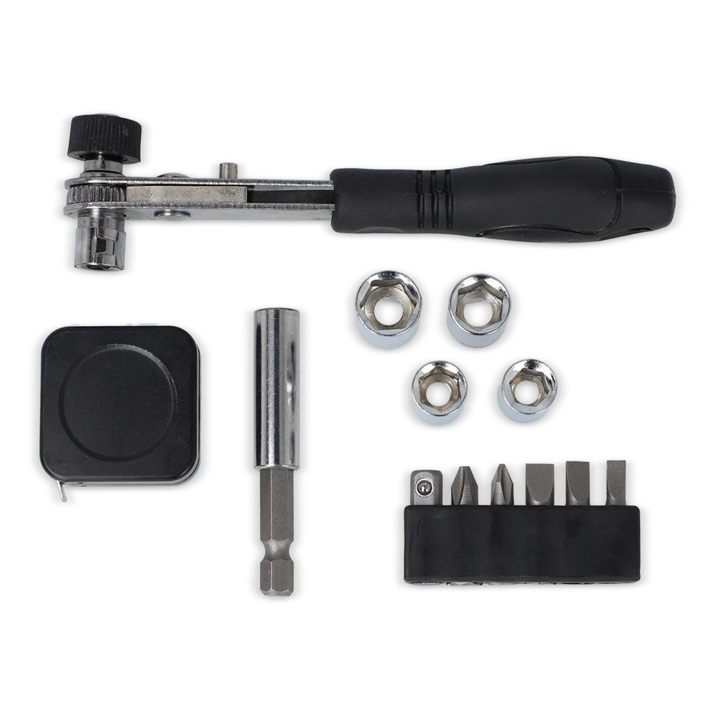 Im Set enthalten sind: 1 x Ratsche, 1 x 1 Meter Maßband und 1 x Schraubendreher-Verbinder.
