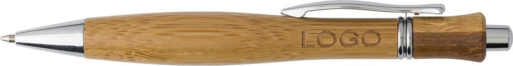 Dieser Kugelschreiber ist ein nachhaltiges Werbemittel. Er besteht primär aus schnell nachwachsendem Bambus. Der Stift schreibt durchgängig in der dokumentenechten Farbe Schwarz. Metallakzente verleihen dem Design einen hochwertigen Touch. Du kannst diesen Bambus-Kugelschreiber individuell mit deinem Logo bedrucken lassen.