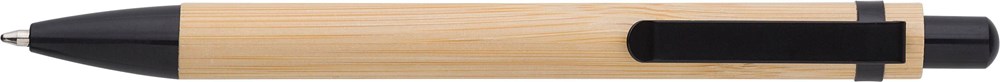 Der Kugelschreiber besteht hauptsächlich aus echtem Bambus. Er verfügt über Metallakzente für eine edle Optik. Die Schreibeinheit nutzt eine langlebige, blau schreibende Tintenmine. Der Stift ist als variables Produkt in den Farben Schwarz und Natur (Braun) erhältlich. Wähle die Farbe, die am besten zu deinem Corporate Design passt.
