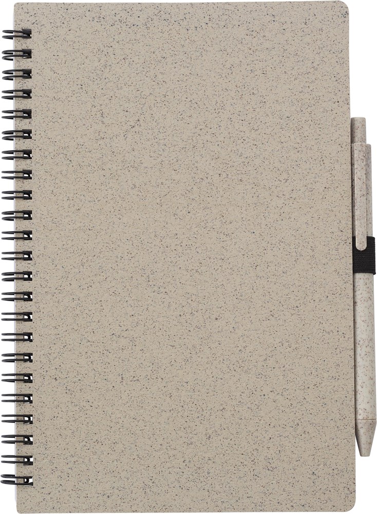 Dieses Produkt ist das Notizbuch Massimo im Format A5. Es zeichnet sich durch seine umweltbewusste Materialwahl aus. Die Hülle besteht aus einer Mischung von Weizenstroh und PP. Im Lieferumfang ist ein passender Stift aus Weizenstroh enthalten. Der Stift ist mit blauer Tinte gefüllt. Das Notizbuch verfügt über 70 gelinierte Seiten. Das Notizbuch Massimo ist ein hochwertiges Werbemittel.