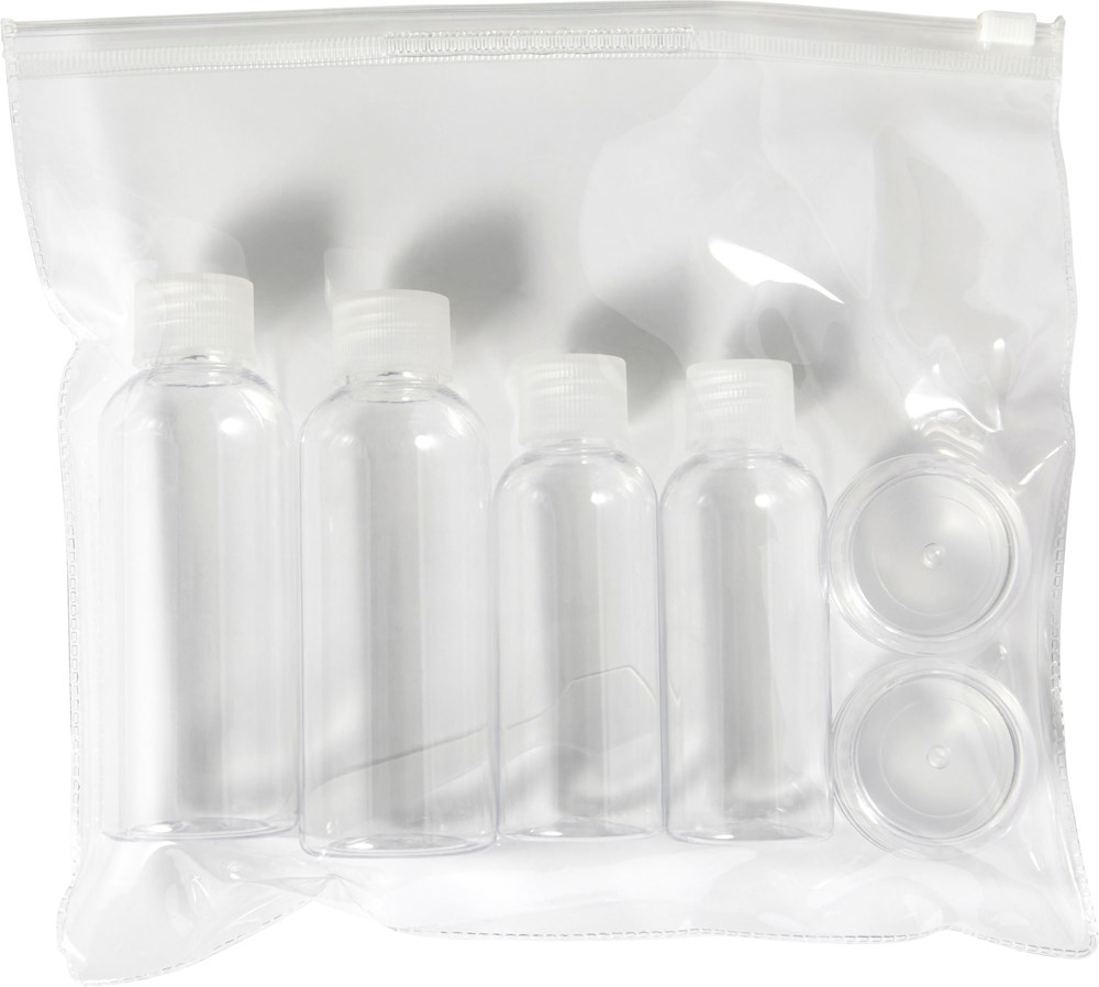 Dieses 6-teilige Reise-Set ist ideal für den Transport von Flüssigkeiten im Handgepäck. Das Set entspricht den gängigen Vorschriften für Flugreisen. Es besteht aus robustem PETG-Material. Du kannst dieses Reise-Set mit deinem eigenen Logo bedrucken lassen. Es eignet sich hervorragend als Werbeartikel für deine Kunden oder bei Events.