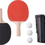 Das Hauptmaterial der Schläger und des Netzes ist robuster ABS-Kunststoff. Im Set sind zwei Schläger enthalten. Du erhältst zudem drei Standard-Tischtennisbälle. Das Netz ist ausziehbar und passt auf die meisten Tischbreiten. Die Aufbewahrungstasche besteht aus recyceltem PET (rPET). Die Farbe des Sets und der Tasche ist Schwarz. Das Set ist kompakt und leicht zu transportieren.