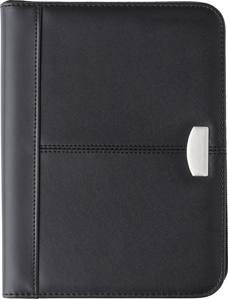 Die Mappe ist im praktischen A5-Format gehalten. Das Material ist langlebiger Lederfaserstoff (Bonded Leder). Ein Reißverschluss sichert den gesamten Inhalt. Im Inneren befinden sich verschiedene Einsteckfächer. Diese sind für Visitenkarten und Dokumente vorgesehen. Ein liniertes Schreibblock ist integriert. Die Mappe verfügt zudem über eine kleine Metallplatte zur individuellen Gravur (Stift nicht im Lieferumfang enthalten).