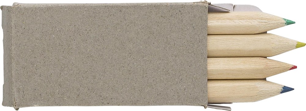 Das Set enthält vier einzelne Mini-Bleistifte. Die Bleistifte selbst sind aus natürlichem Holz gefertigt. Sie haben unterschiedliche Außenfarben. Die Stifte schreiben alle in Blau. Die Umverpackung besteht aus einem recycelbaren Material. Das Produkt ist der Kategorie Werbeartikel und Schreibwaren zuzuordnen.
