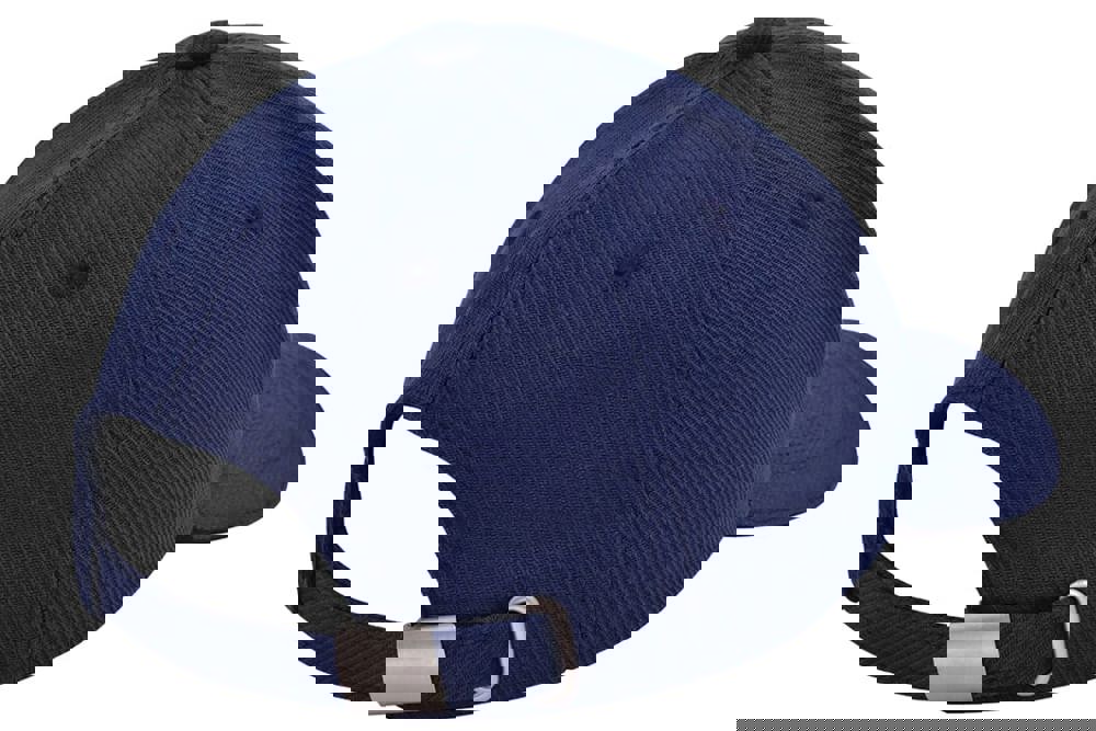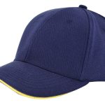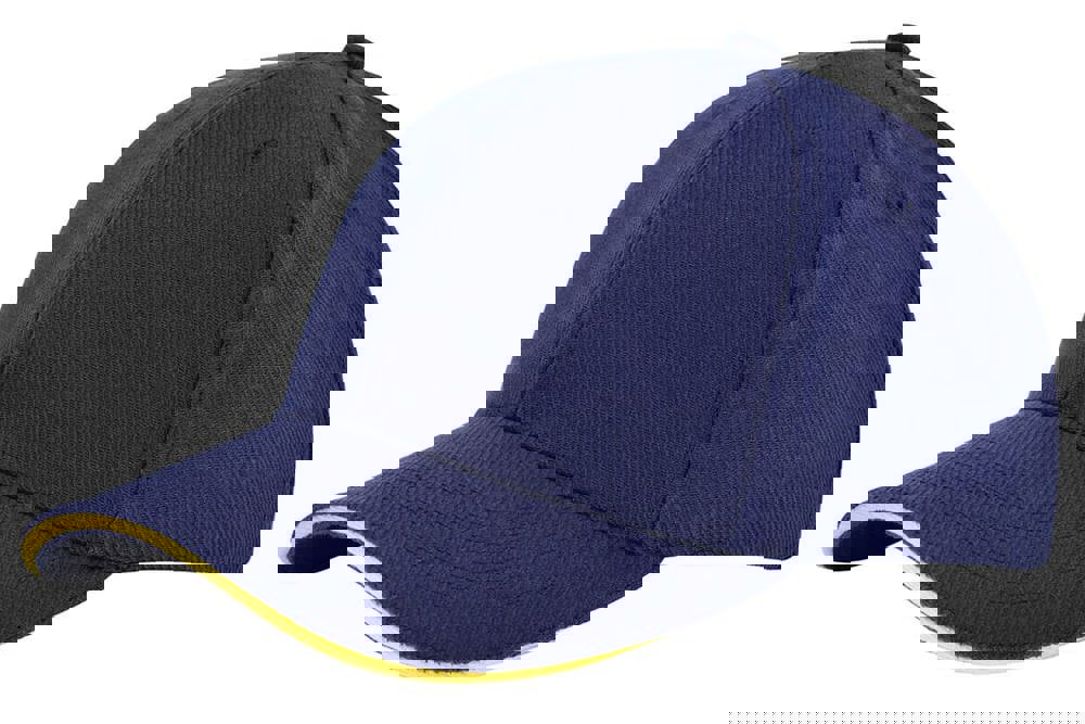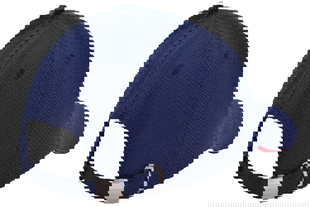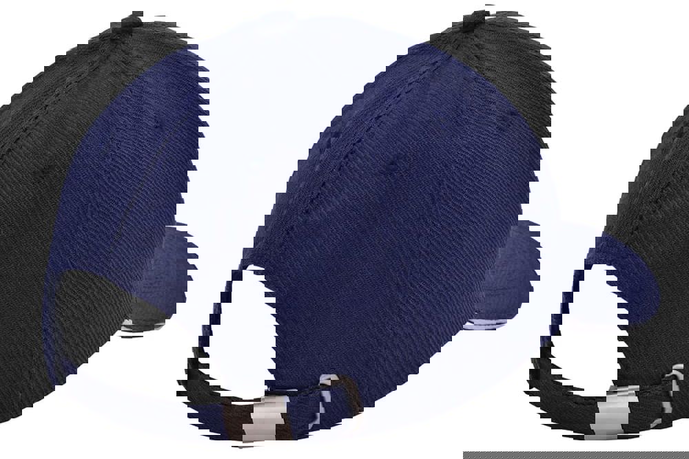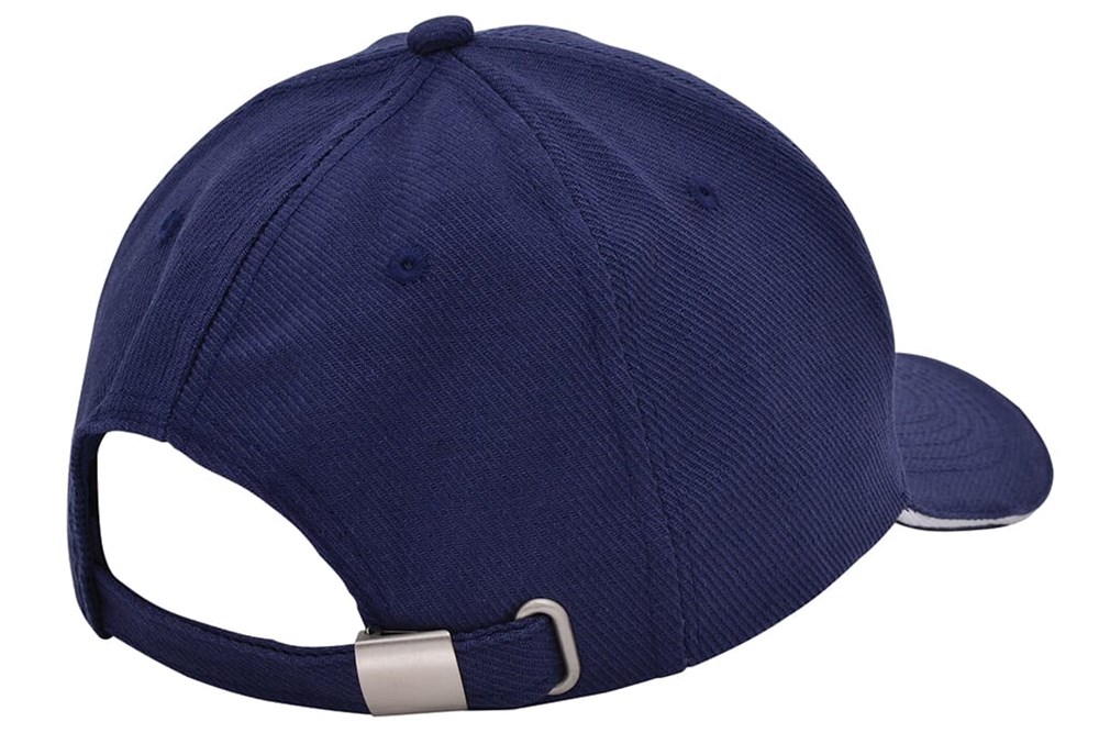Die Kappe ist aus robustem Canvas-Katoen gefertigt. Sie verfügt über sechs sauber verarbeitete Panels. Die Front ist verstärkt, um eine feste Form zu gewährleisten. Der Schirm enthält einen farblich abgesetzten Sandwich-Kontrastrand. Die Größe der Kappe ist verstellbar. Dies geschieht mithilfe einer silbernen Metallschnalle am Hinterkopf. Die Kappen sind in Navy, Weiß, Schwarz, Rot, Grau und Gelb erhältlich.