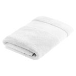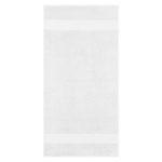 Dies ist ein nachhaltiges Handtuch für Werbezwecke. Das Handtuch hat die Maße 100 x 50 cm. Es besteht zu 100 % aus recycelter Baumwolle. Die hohe Grammatur beträgt 450 g/m². Diese Eigenschaft sorgt für eine gute Saugfähigkeit. Das Handtuch ist umweltfreundlich und langlebig. Es verfügt über zwei dekorative, sechs Zentimeter breite Abschlussbänder.