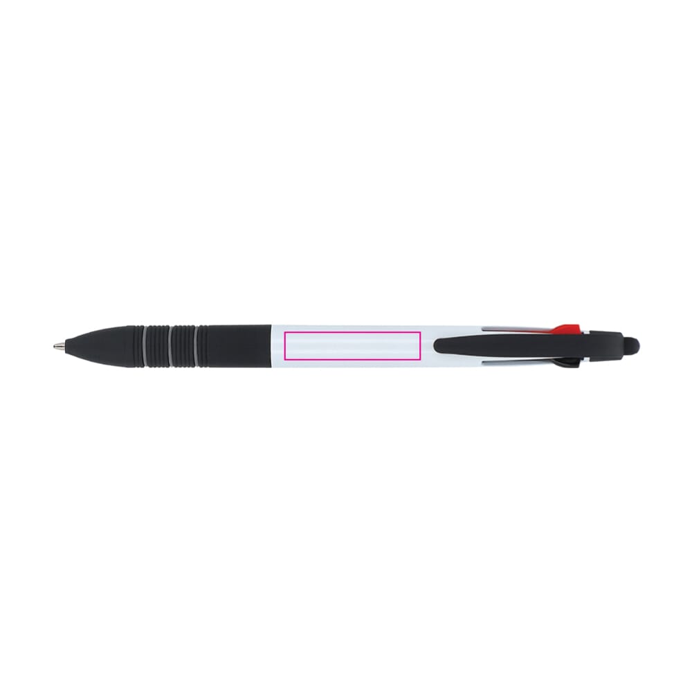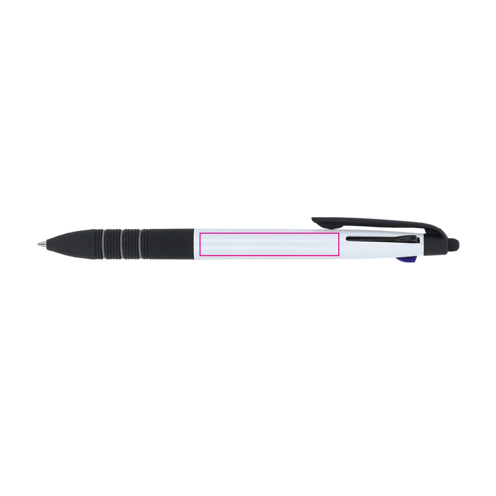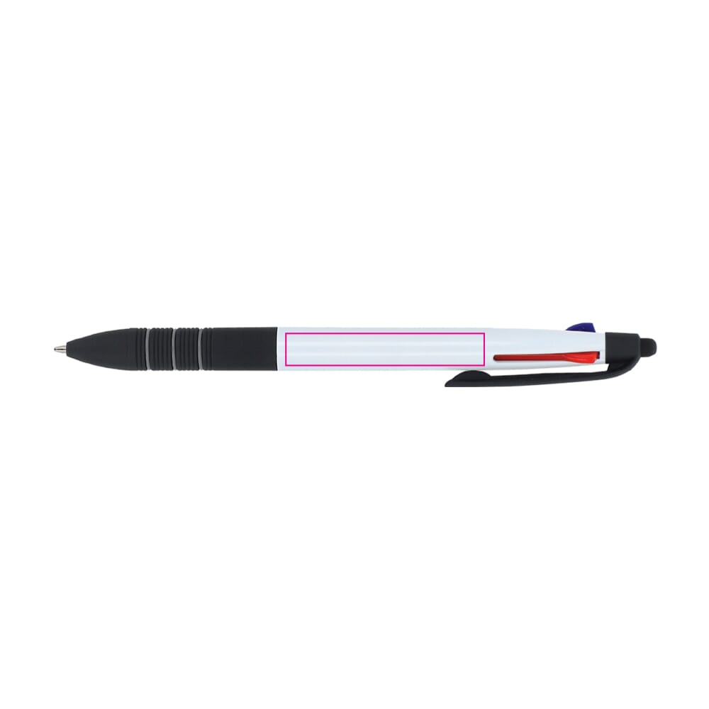 Dieser Werbekugelschreiber vereint drei Standard-Schreibfarben. Die Schreibfarben sind Schwarz, Blau und Rot. Der Schaft des Stiftes verfügt über eine ergonomische Griffzone. Dies gewährleistet einen angenehmen Schreibkomfort. Die Kappe ist mit einem Clip versehen. Der Stylus ermöglicht die einfache Bedienung von Touchscreens. Wähle die Farbe des Korpus passend zu deinem Corporate Design.