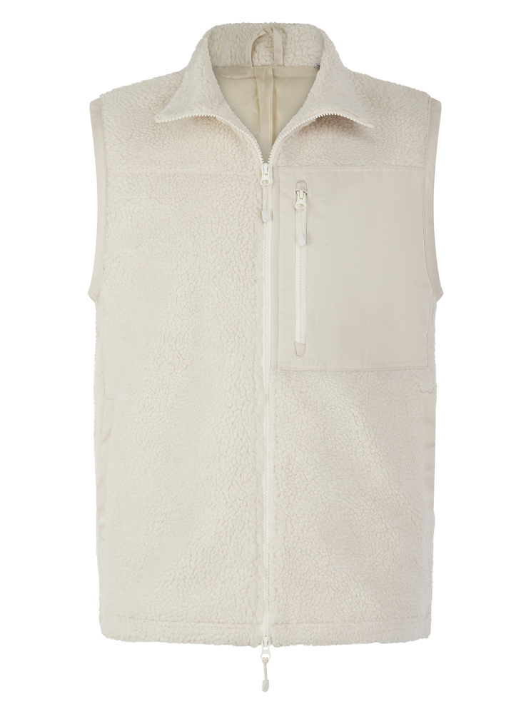 Das Gilet wird aus 100 % recyceltem Polyester hergestellt. Es verfügt über einen durchgehenden Reißverschluss. Kontrastierende Köperstoffpaneele sind aufgesteppt. Eine Brusttasche mit Reißverschluss bietet sicheren Stauraum. Die Seitentaschen sind mit Blenden und praktischen Druckknöpfen ausgestattet. Verfügbare Farben sind Navy, Black, Natural und Dark Olive.