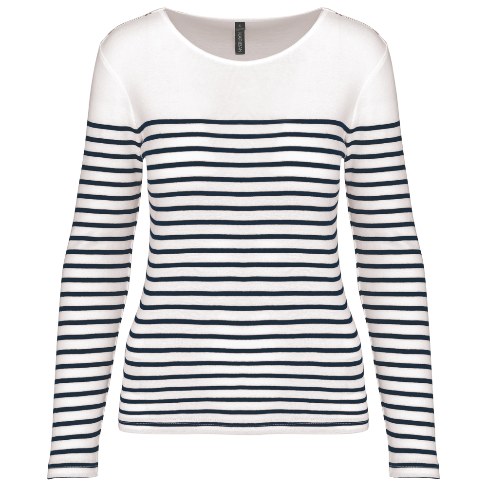 Du betrachtest ein gestreiftes Damen-Langarm-T-Shirt.