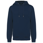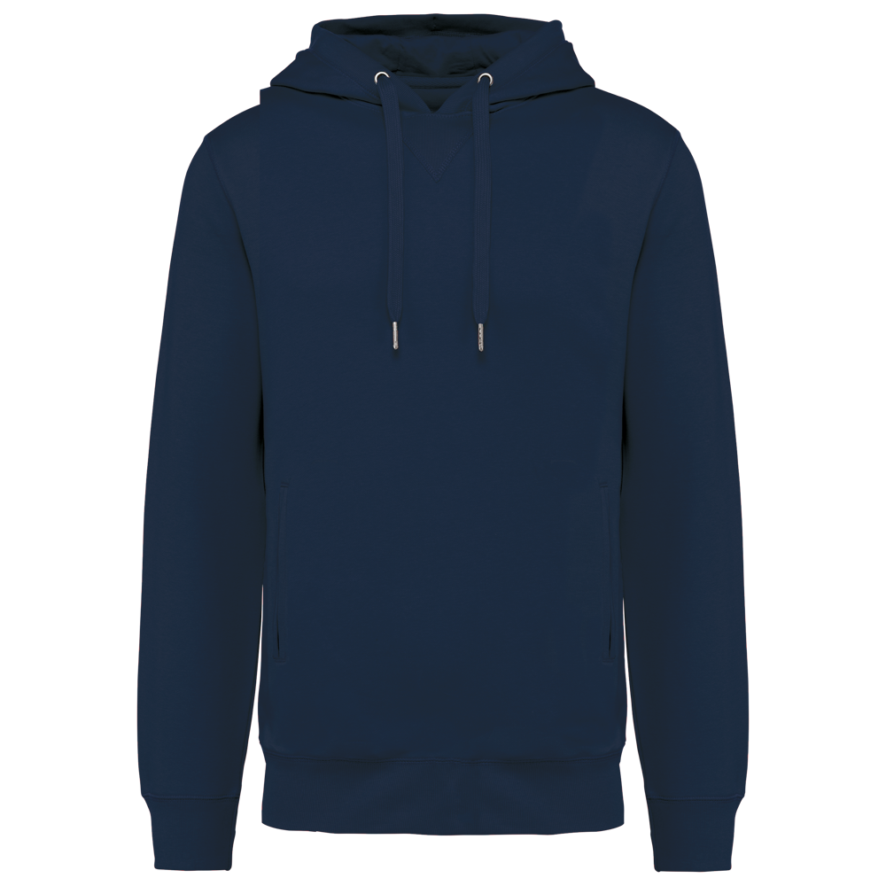 Der Hoodie besteht aus einem Bio-Baumwolle/Recycling-Polyester-Mix. Die Gewebezusammensetzung beträgt 80% Bio-Baumwolle / 20% recyceltes Polyester. Oxford Grey hat 75% Bio-Baumwolle / 25% recyceltes Polyester. Das Material ist Fleece French Terry und enzymgewaschen. Die Passform ist gerade (Straight Cut). Verfügbare Größen reichen von XXS bis 4XL. Farben umfassen Navy, Black und Oxford Grey. Der Sweater hat eine gefütterte Kapuze und zwei Fronttaschen. Die Arm- und Saumabschlüsse sind gerippt. Metallische Enden an den Kapuzenkordeln sind inklusive.