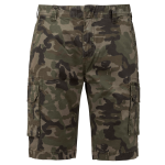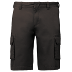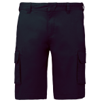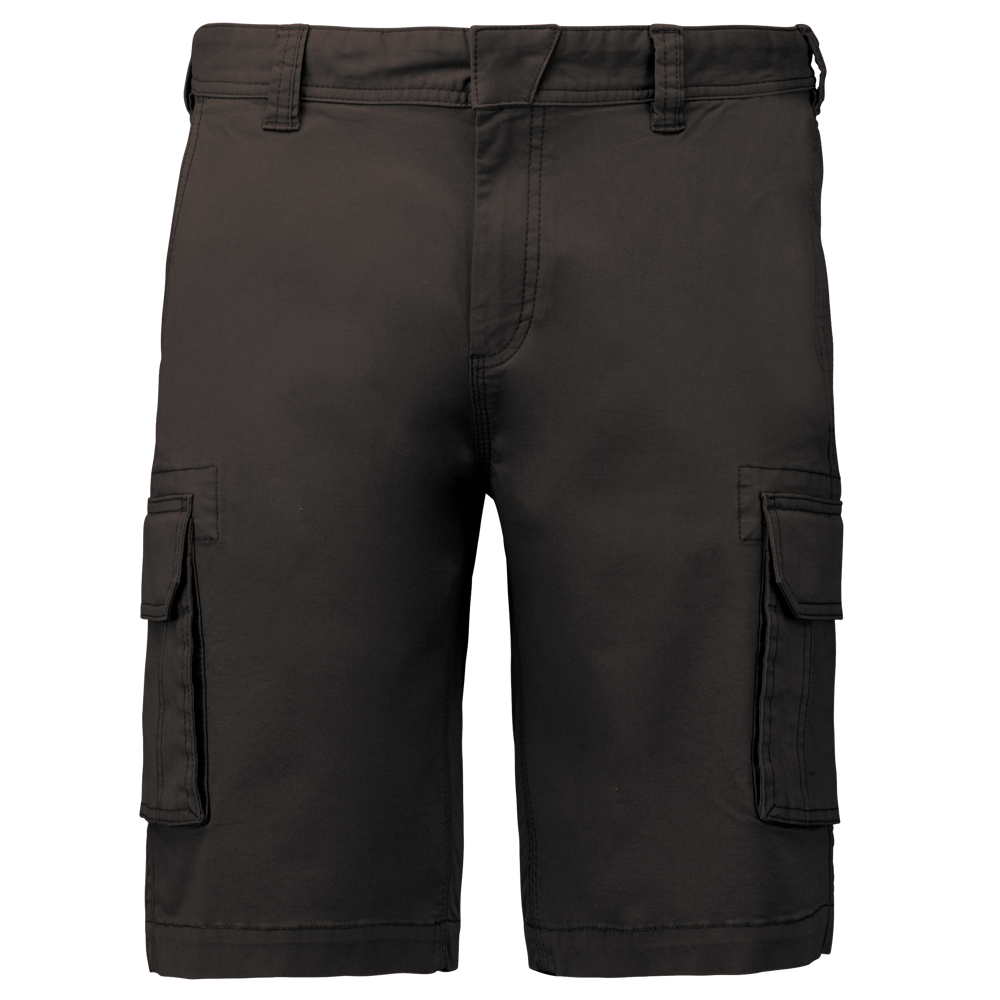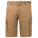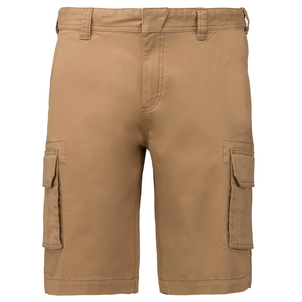 Die Bermuda ist mit einem stabilen Reißverschluss ausgestattet. Der Verschluss wird durch einen verdeckten Metallknopf gesichert. Die Twill-Shorts verfügt über zwei Vordertaschen. Zusätzlich sind zwei Seitentaschen im Cargo-Stil mit Patte vorhanden. Die Rückseite hat ebenfalls zwei Gesäßtaschen mit Patte. Das Produkt ist in variablen Größen und Farben verfügbar.