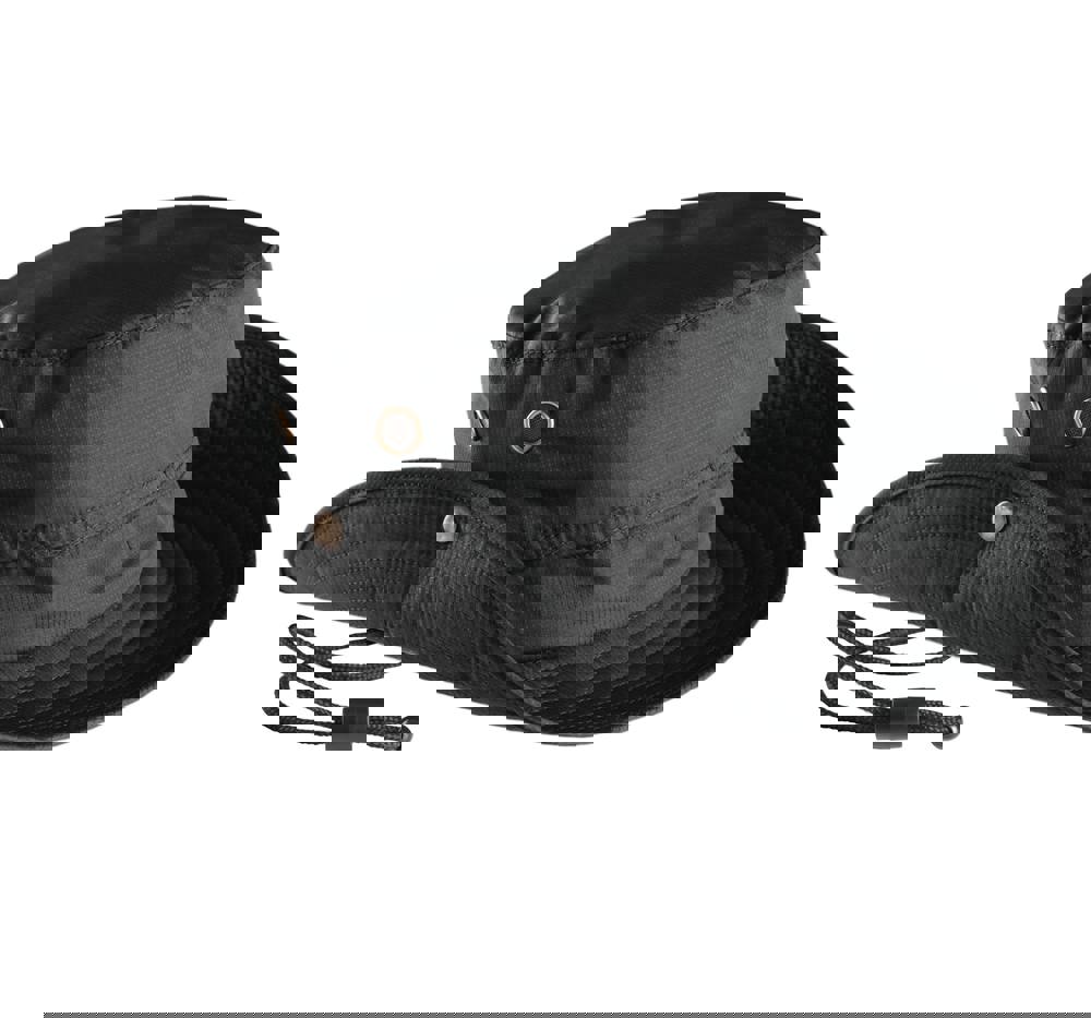 Der Hut besteht aus robustem 100% Polyester. Er ist mit einer wetterfesten Induktionsschicht versehen. Die elliptische Form gewährleistet eine gute Passform. Die breiten Ränder sind flexibel. Du kannst die Hutränder mithilfe von Druckknöpfen hochklappen und fixieren. Integrierte Belüftungslöcher sorgen für einen hohen Tragekomfort. Ein verstellbares Kordelband mit Stopper sichert den Hut bei Wind. Der Outdoor Hut ist in den gängigen Größen M und XL erhältlich.