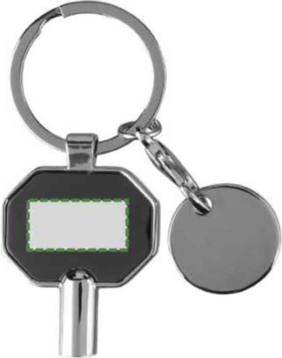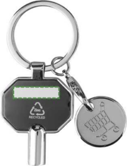 Material: Recycelte Zinklegierung. Farbe: Schwarz (Variabel). Funktion: 3-in-1-Tool (Schlüsselring, Einkaufswagenchip, Entlüftungsschlüssel). Entlüftungsschlüsselgröße: 5 x 5 mm (quadratisch). Ausstattung: Wird mit stabilem Metall-Schlüsselring geliefert. Hinweis: Produkt trägt das Recycled-Logo. Verpackung: Einzelverpackung in umweltfreundlichem Kartonumschlag.