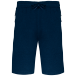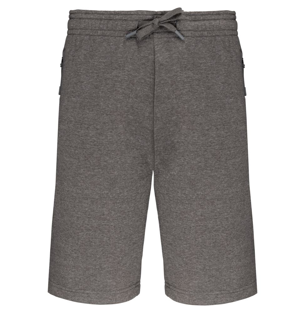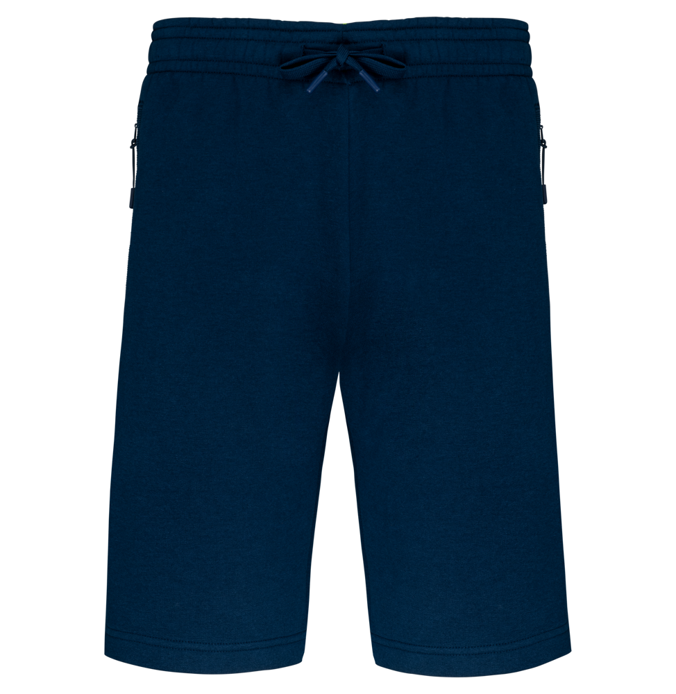 Die Shorts besteht aus einem robusten Materialmix: 65% Polyester und 35% Baumwolle. Das innen gebürstete Fleece sorgt für Weichheit. Der elastische Bund ist mit einem farblich passenden Kordelzug ausgestattet. Für Komfort wurde die Innenseite des Bundes weich verarbeitet. Die Bermuda Shorts verfügen über zwei seitliche Reißverschlusstaschen. Zusätzlich sind eine Meshtasche und eine kontrastierende Handytasche integriert. Die Beinabschlüsse sind doppelt vernäht.