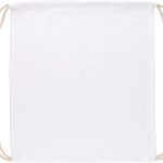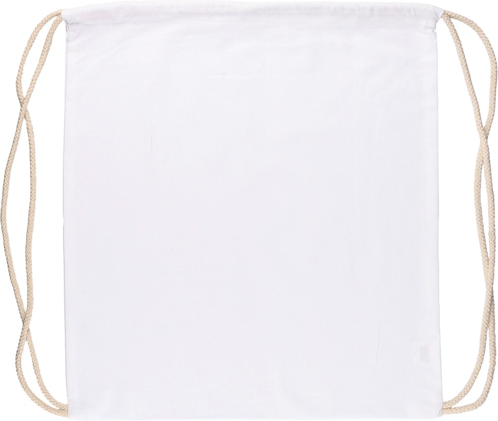 Der Rucksack besteht aus 140 g/m² starker Baumwolle. Er ist in verschiedenen Farben erhältlich, darunter Weiß, Schwarz, Rot und Blau. Die Baumwolle ist gefärbt und OEKO-TEX® STANDARD 100 zertifiziert. Diese Zertifizierung gewährleistet die Abwesenheit von Schadstoffen. Der Zugverschluss dient gleichzeitig als Tragegurt.