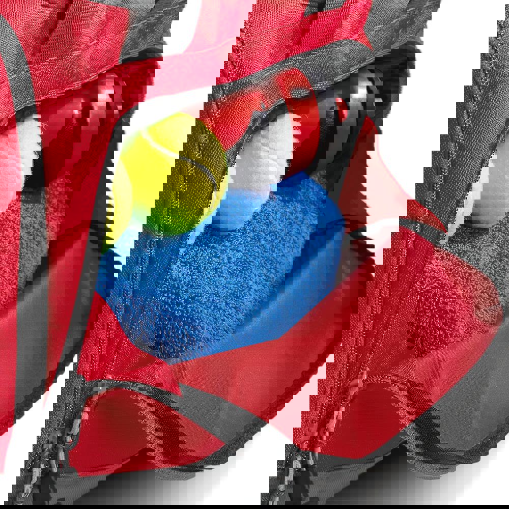 Die Tasche kombiniert 600D und 420D Polyester. Sie besitzt ein separates Fach für Schuhe oder nasse Kleidung. Der Schulterriemen ist abnehmbar und in der Länge verstellbar. Der Tragegriff ist gepolstert und sorgt für Komfort. Die Tasche hat schützende Gummifüße am Boden. Sie verfügt über seitliche Reißverschlusstaschen. Ein Außennetzfach bietet zusätzlichen Stauraum. Die verwendeten Stoffe sind wasserabweisend.