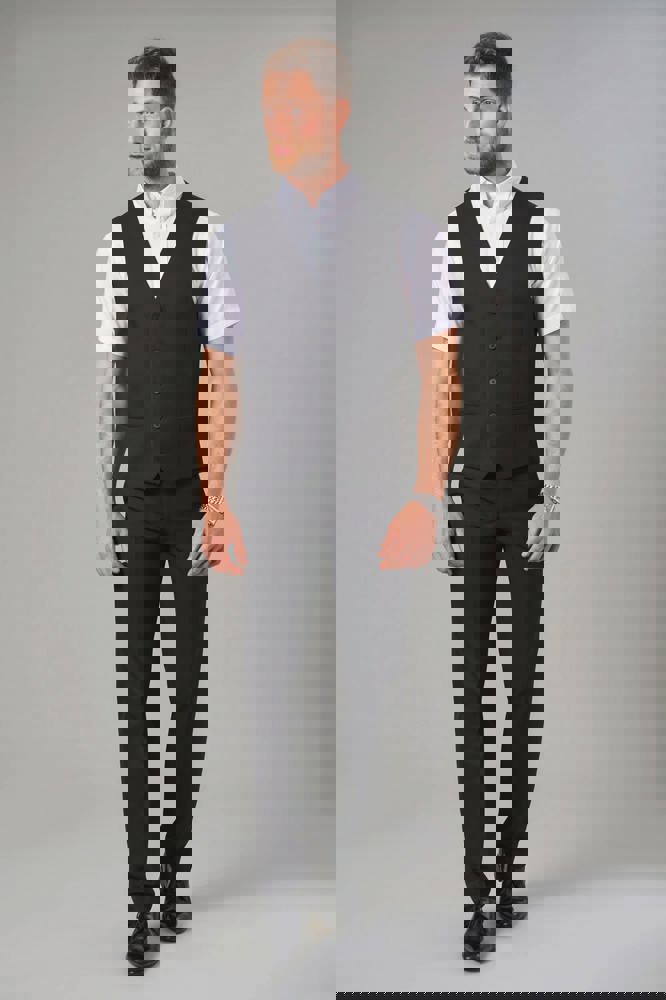 Das Gilet besitzt eine elegante Satinfütterung auf der Rückseite. Die Rückseite ist verstellbar für eine optimale Passform. Es verfügt über fünf Knöpfe an der Vorderseite. Zwei dezente Taschen sind in das Design integriert. Das Gilet ist in den klassischen Farben Navy und Black verfügbar. Die Größen reichen von XS bis XL.