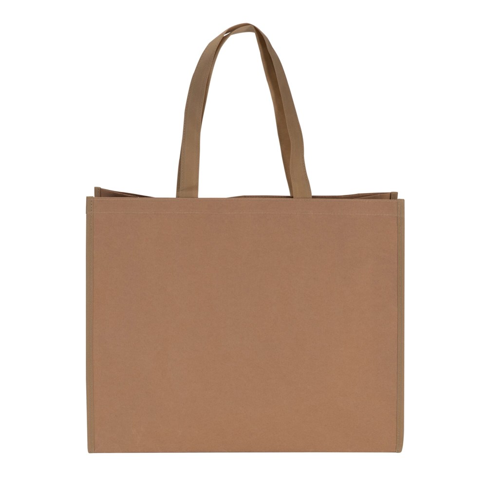 Du erhältst eine robuste und geräumige Tragetasche aus verstärktem Kraftpapier.