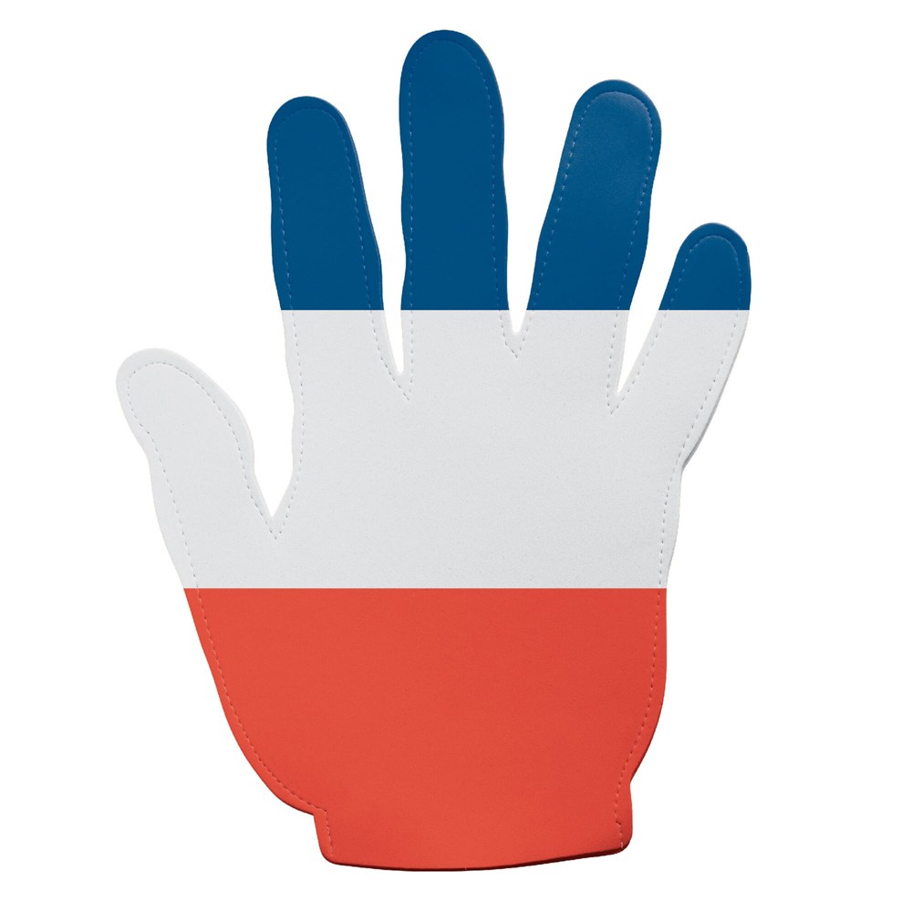 Die Event Hand zeichnet sich durch ihre robuste Ausführung aus. Das Design zeigt deutlich die Farben Blau, Weiß und Rot der französischen Flagge. Das große Format maximiert die optische Wirkung bei dichtem Gedränge. Das Produkt ist leichtgewichtig und einfach zu handhaben. Es bietet ausreichend Fläche für detaillierte Logodrucke.