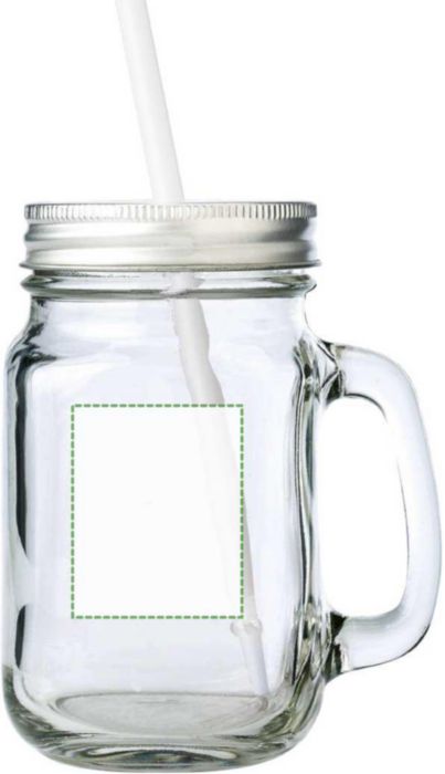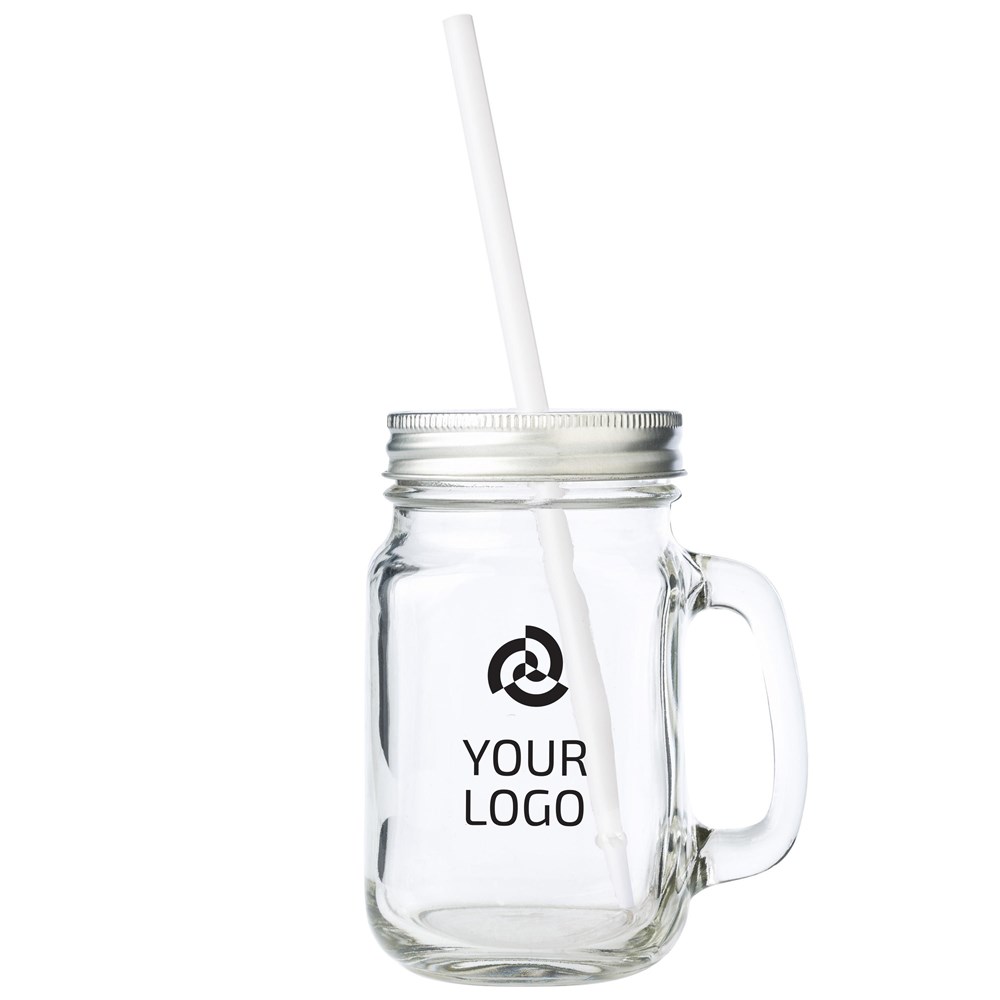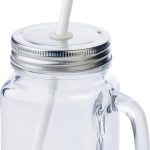 Der Glaskrug Sakina ist ein hochwertiger Werbeartikel. Es handelt sich um einen klassischen Mason Jar aus klarem Glas. Der Krug hat ein Fassungsvermögen von 480 ml. Er wird mit einem silberfarbenen Schraubverschluss geliefert. Ein passender Kunststoff-Trinkhalm ist im Lieferumfang enthalten. Du kannst diesen Glaskrug Sakina mit deinem eigenen Logo bedrucken lassen.
