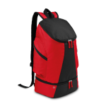 Das Hauptmaterial ist reißfestes 600D Polyester. Der Rucksack enthält verstärkendes 300D Ripstop-Gewebe. Das Schuhfach ist separat zugänglich und mit Eyelets belüftet. Zwei Seitentaschen bieten weiteren Stauraum. Die Rückseite ist für Tragekomfort gepolstert. Die Polsterung ist luftdurchlässig. Die Schultergurte sind in der Länge verstellbar. Der Sportrucksack ist als One-Size-Modell verfügbar.