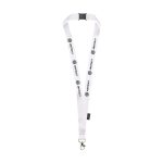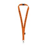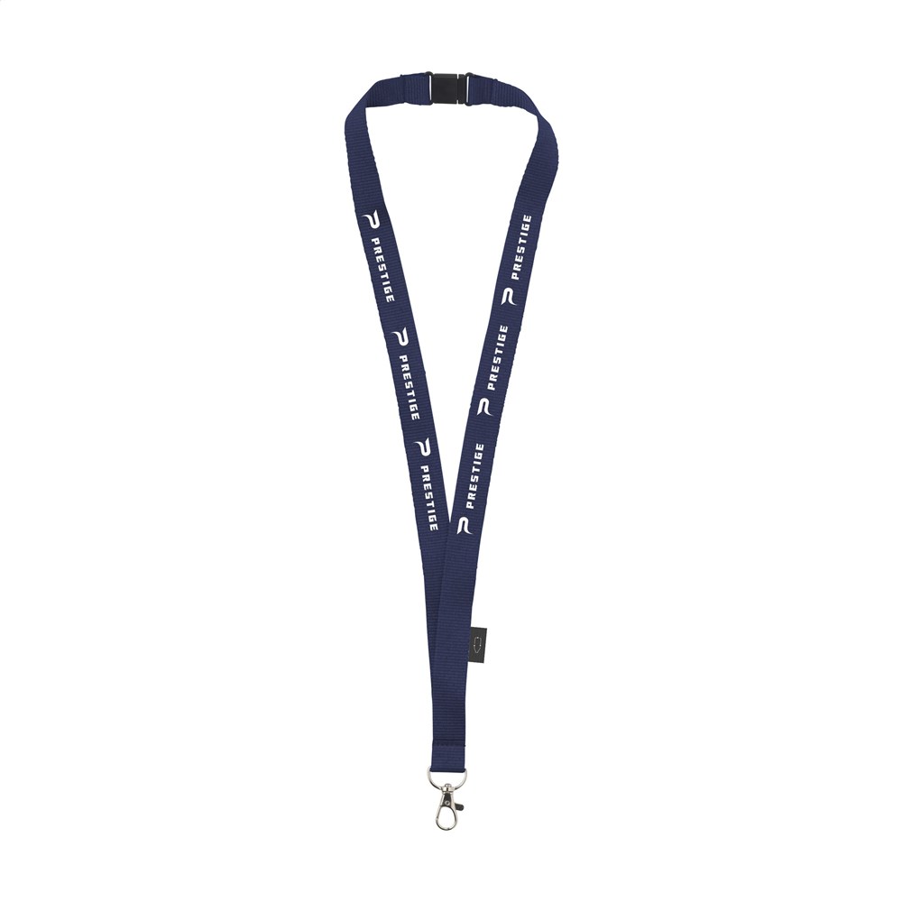 Das Material besteht aus GRS-zertifiziertem RPET. Der Anteil an recyceltem Material beträgt insgesamt 58 %. Das Lanyard besitzt einen stabilen Karabinerhaken aus Metall für eine sichere Befestigung. Ein integrierter Sicherheitsverschluss öffnet sich bei starkem Zug automatisch. Du wählst aus den Farben Navy, Weiß, Schwarz, Rot, Orange, Blau oder Grün.
