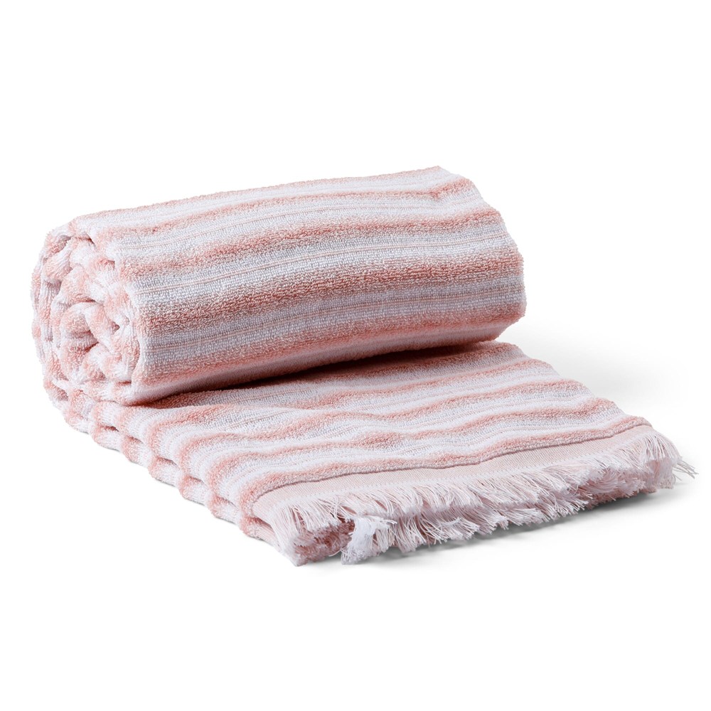 Das Badetuch ist in den Farben Blau, Beige, Rosa und Hellgrau lieferbar.