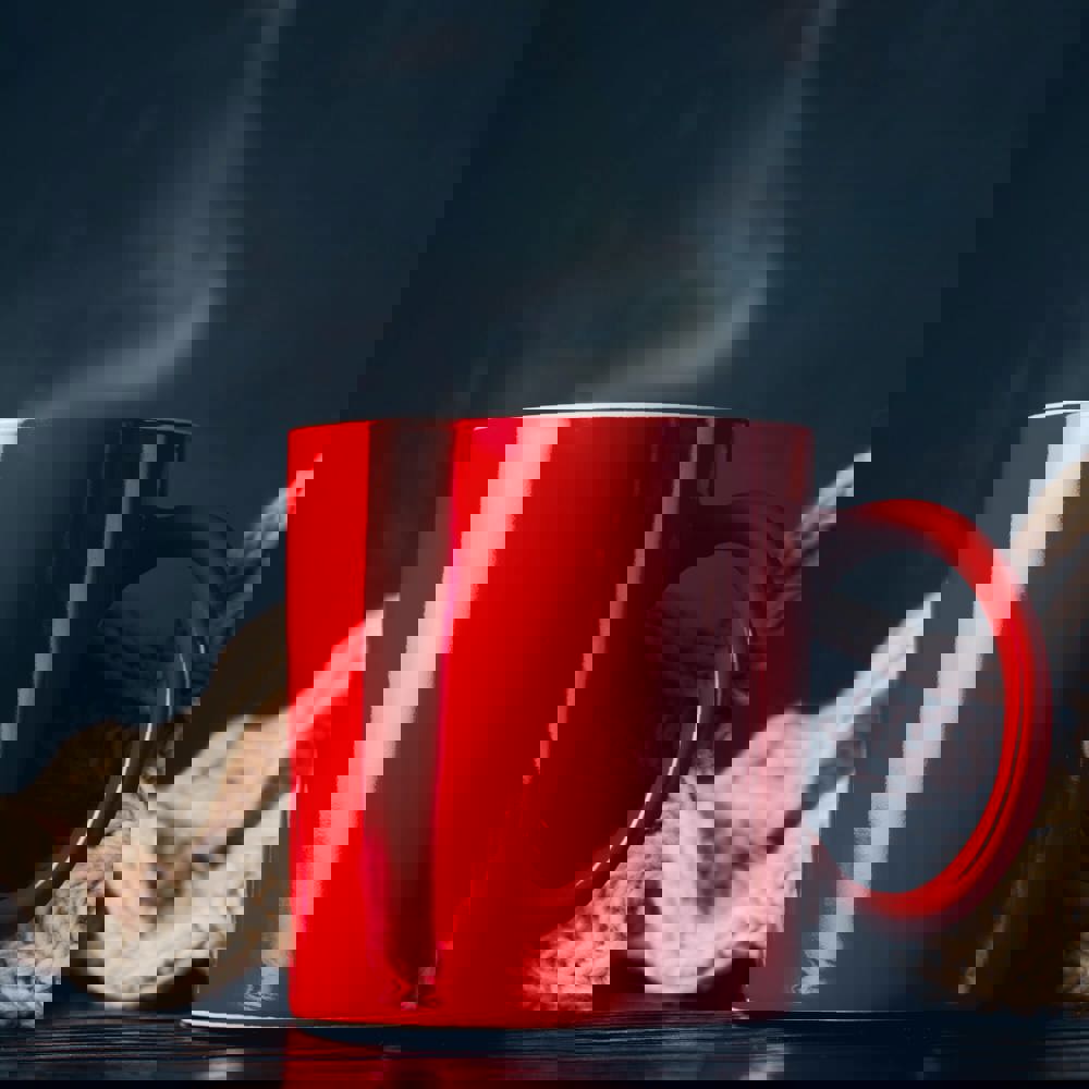 Die Tasse besteht aus langlebigem Steingut (Keramik). Das Fassungsvermögen beträgt exakt 300 ml. Die rote Außenfarbe sorgt für eine hohe Sichtbarkeit. Die weiße Innenseite bietet einen sauberen Look. Die Tasse ist für den intensiven, täglichen Gebrauch konzipiert.