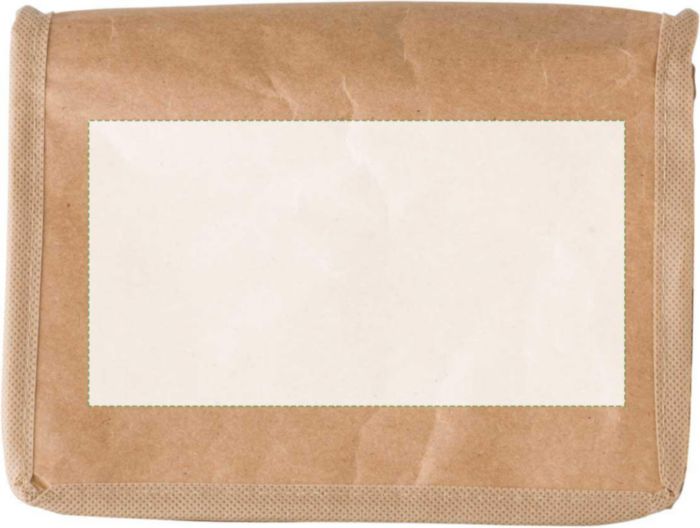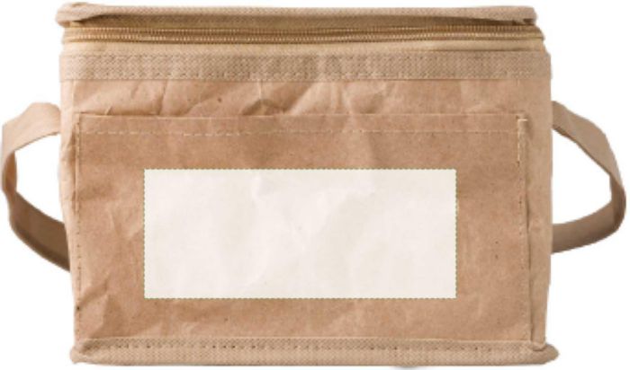 Die Außenschicht besteht aus strapazierfähigem Papier mit 80 g/m² Dichte. Die Innenseite ist vollständig mit isolierendem Aluminium ausgekleidet. Die Kühltasche verfügt über ein Fassungsvermögen von 3 Litern. Für zusätzlichen Stauraum ist an der Vorderseite ein separates Fach integriert. Ein stabiler Trageriemen gewährleistet den komfortablen Transport. Die Tasche wird standardmäßig in der Farbe Braun geliefert.