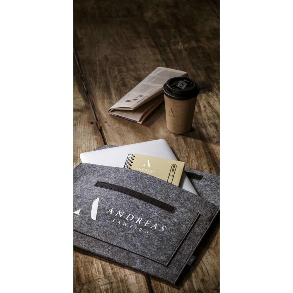 Diese Schutzhülle besteht zu 95 % aus recyceltem Material. Es handelt sich um robusten RPET-Filz. Die vollständige Materialkette ist GRS-zertifiziert. Die Hülle bietet Platz für Geräte bis 15 Zoll. Ein stabiler Klettverschluss sichert den Inhalt zuverlässig. Die Laptop-Cases sind in den Farben Grau und Hellgrau erhältlich.