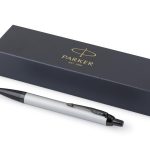 Der Parker IM ist ein hochwertiger Kugelschreiber aus Metall. Er dient als repräsentatives Werbegeschenk. Du erhältst einen zuverlässigen Schreibstift für deine Kunden. Der Kugelschreiber ist in Schwarz und Grau erhältlich. Er schreibt in der Farbe Blau. Jeder Stift wird in einer ansprechenden Geschenkbox geliefert.