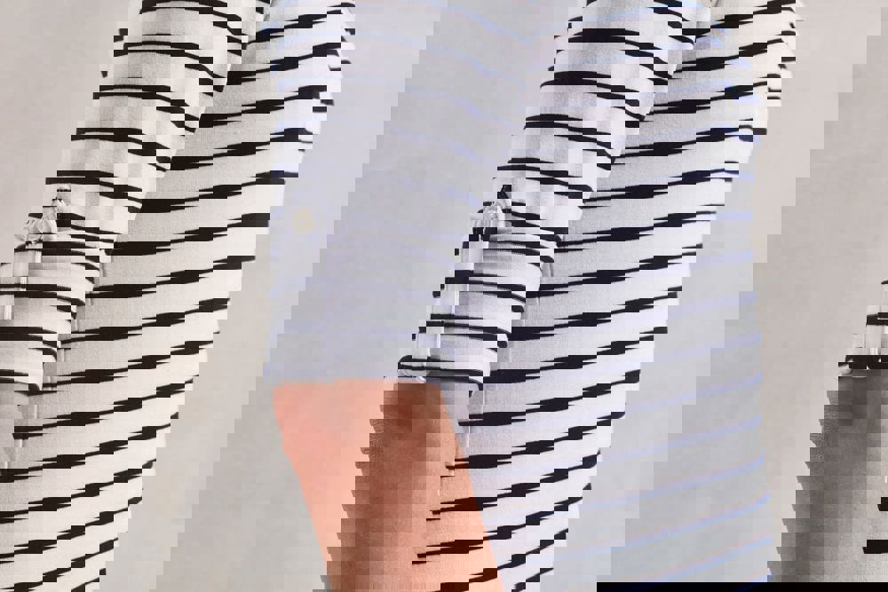 Rippbündchen finden sich an den Ärmelenden und der Kragenpartie.