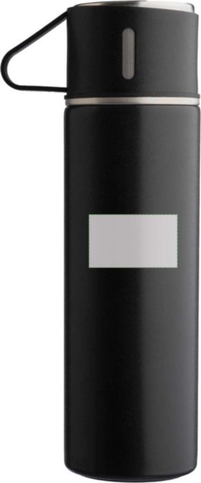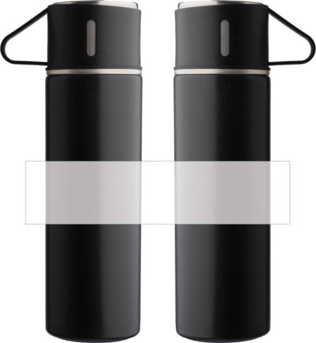Material: Hochwertiger doppelwandiger Edelstahl (s/s304). Fassungsvermögen Flasche: 420 ml. Fassungsvermögen Becher: 150 ml. Eigenschaften: Isolierend und robust. Das Set ist in den Farben Schwarz und Silber verfügbar. Die doppelwandige Konstruktion garantiert eine hohe Langlebigkeit.