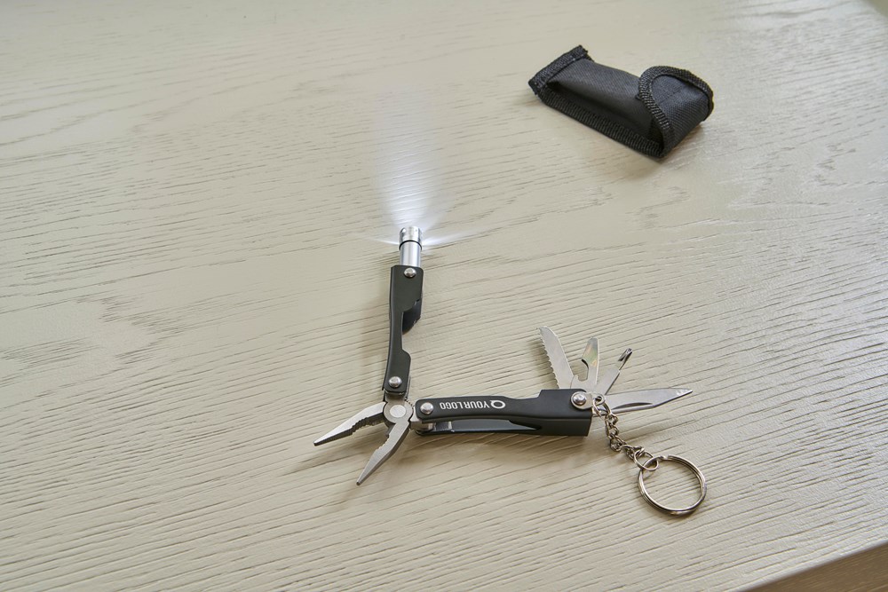 Verwende das Multitool als effektives Promotion-Tool. Es ist ideal für Events und Messen. Deine Zielgruppe sind Geschäftskunden, Vereine und Veranstaltungsteilnehmer. Das Produkt wird in einer schützenden 600D Polyester-Hülle geliefert. Die Hülle besitzt einen Klettverschluss. Sie kann einfach am Gürtel befestigt werden. So ist dein Logo stets sichtbar und einsatzbereit.