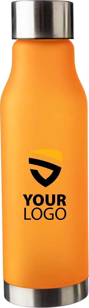 Material: Recyceltes PET (rPET). Volumen: 600 ml. Verschluss: Edelstahl-Deckel. Bodenelement: Edelstahl (201). Veredelung: Matte, gummierte Oberfläche. Verfügbare Farben: Kobaltblau und Orange. Verpackung: Einzeln in Seidenpapier eingewickelt. Die rPET-Trinkflasche ist robust und für den täglichen Gebrauch konzipiert.