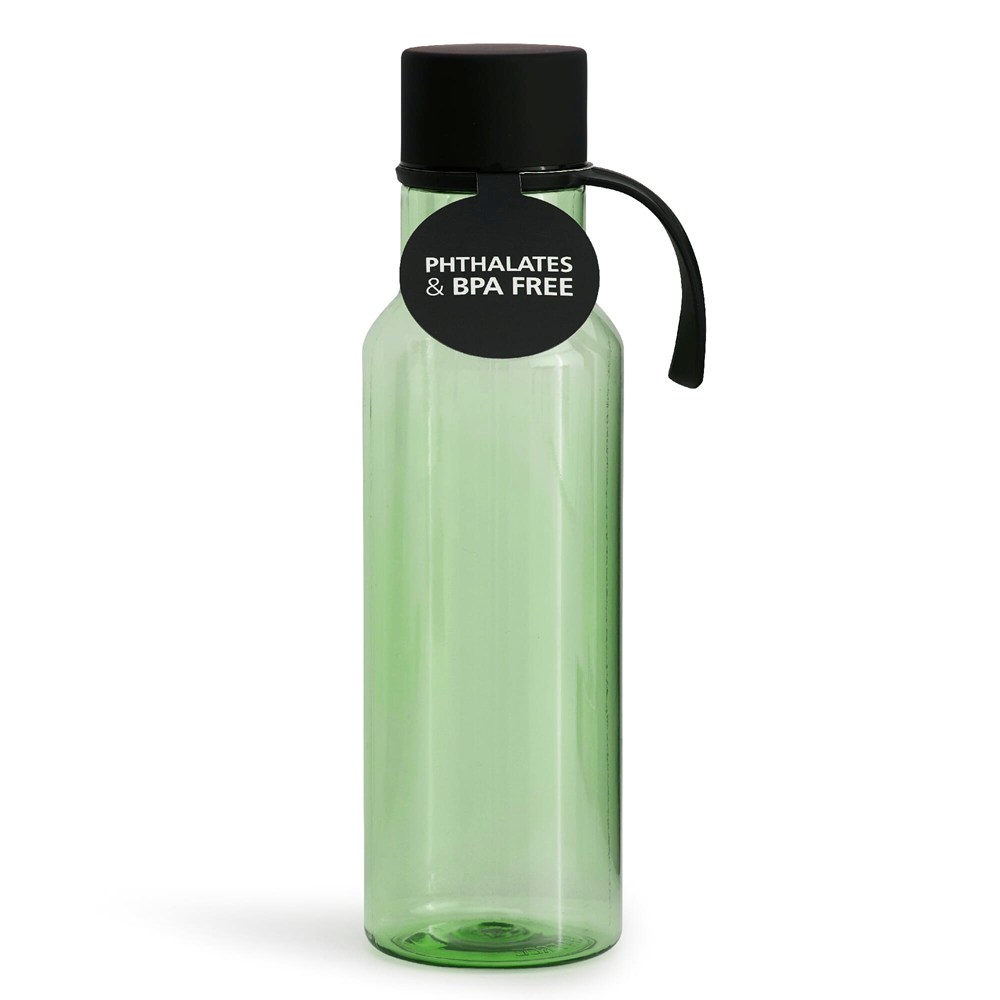 Das Material ist hochwertiger Tritan-Kunststoff. Tritan ist sehr robust und vollständig BPA-frei. Die Flasche ist transparent, schwarz oder farbig erhältlich. Der Verschluss besteht aus Edelstahl und ist gummiert. Dies sorgt für einen sicheren Halt beim Öffnen und Schließen. Eine praktische Trageschlaufe ist integriert. Das Fassungsvermögen beträgt exakt 600 Milliliter.