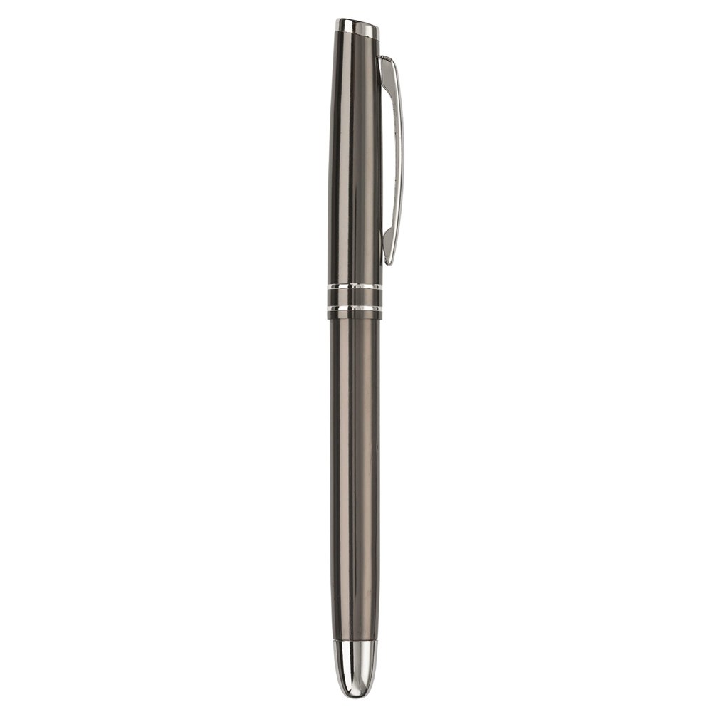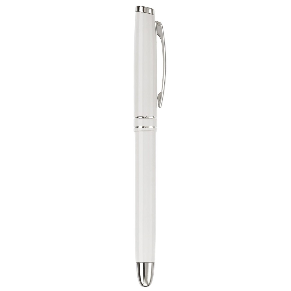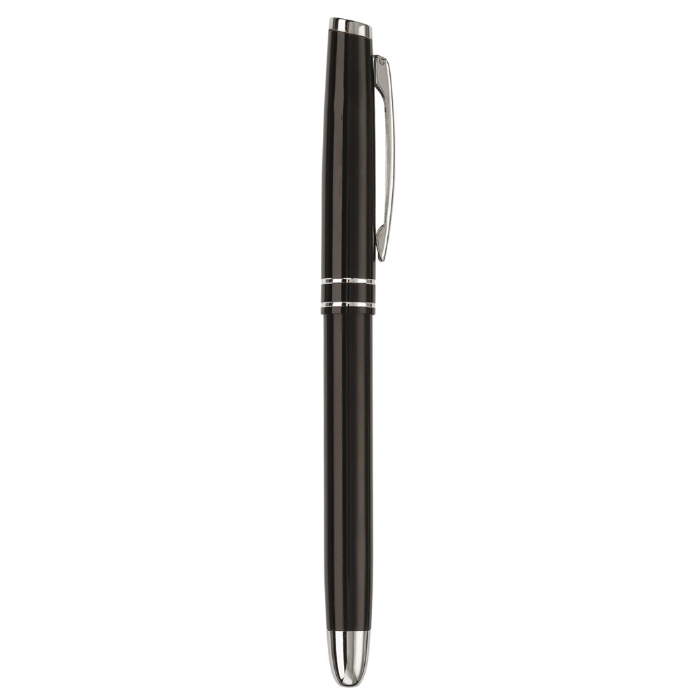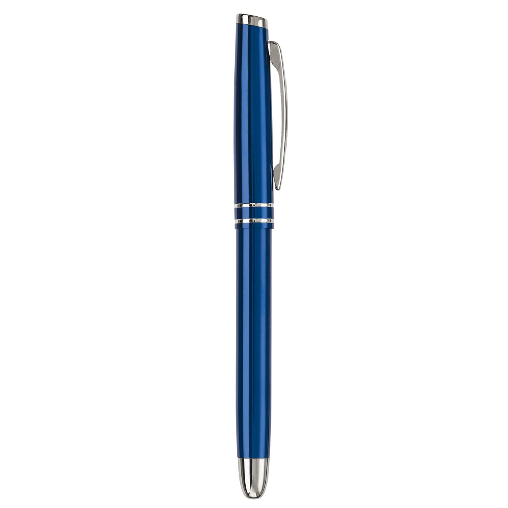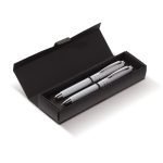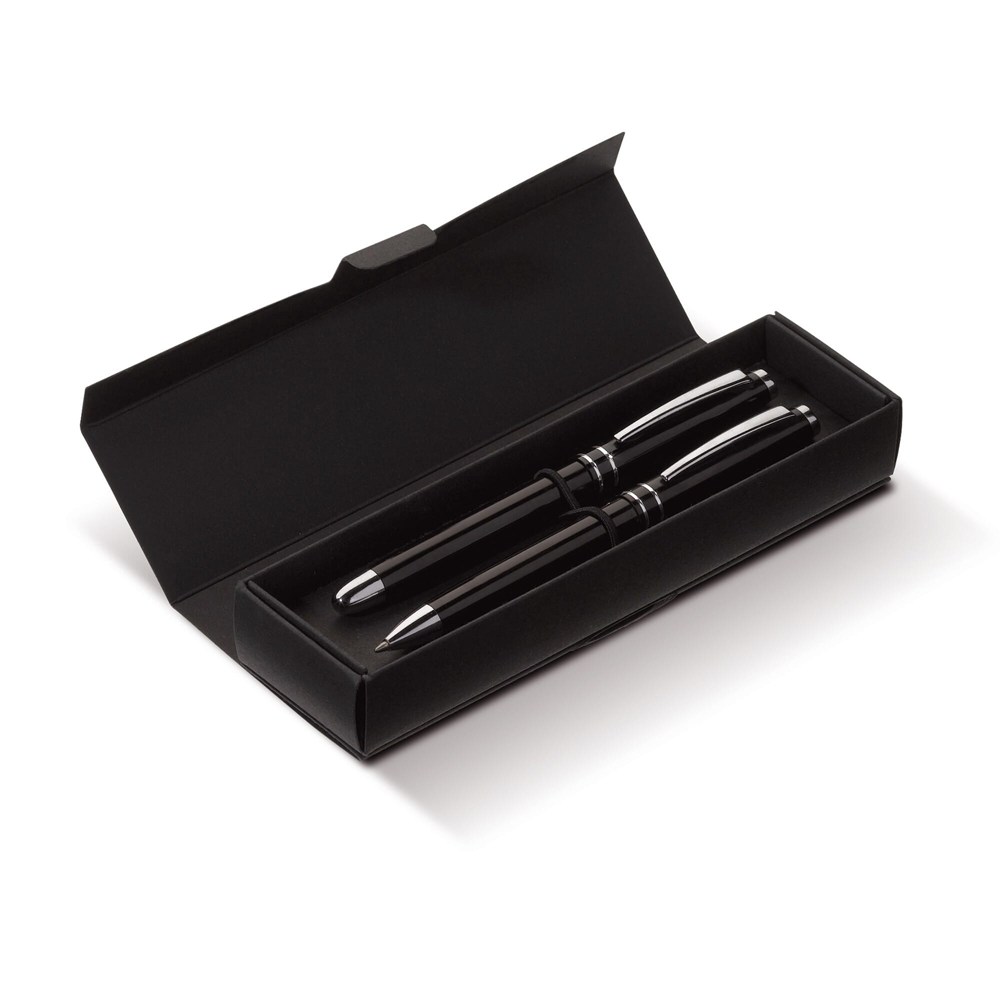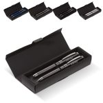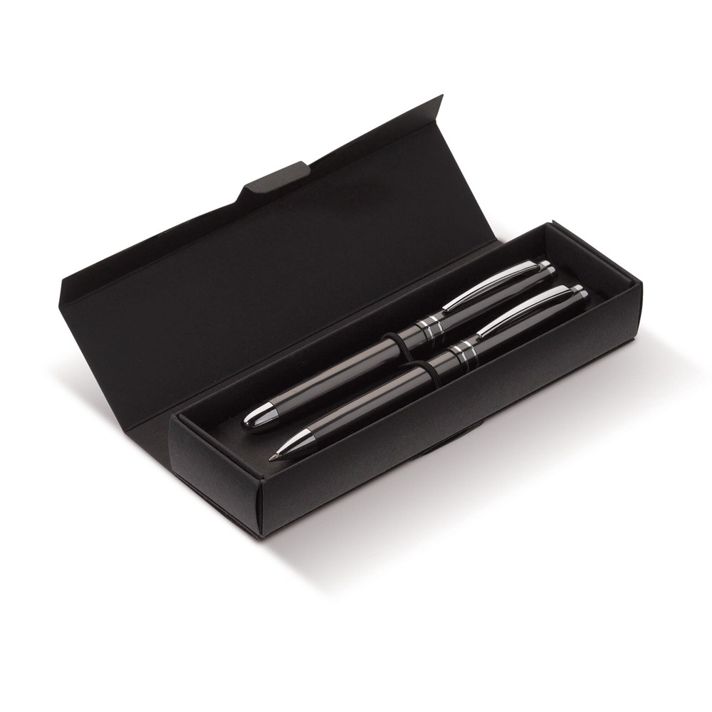 Das Schreibset besteht aus robustem Metall. Der Kugelschreiber nutzt eine praktische Drehfunktion. Der Tintenroller wird mit einer schützenden Kappe geliefert. Beide Stifte sind mit einer blau schreibenden Mine ausgestattet. Das Set ist in den Farben Weiß, Schwarz, Dunkelblau und Dunkelgrau verfügbar.