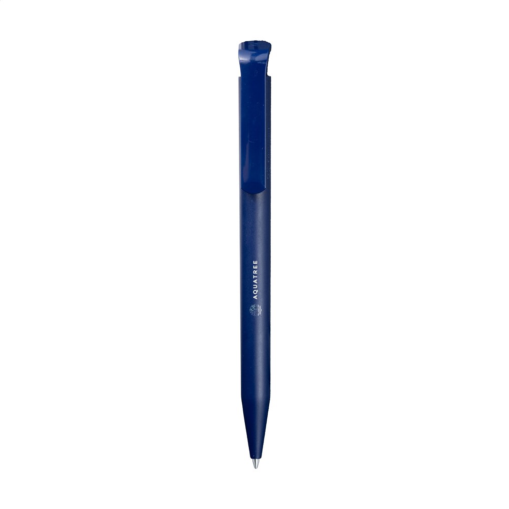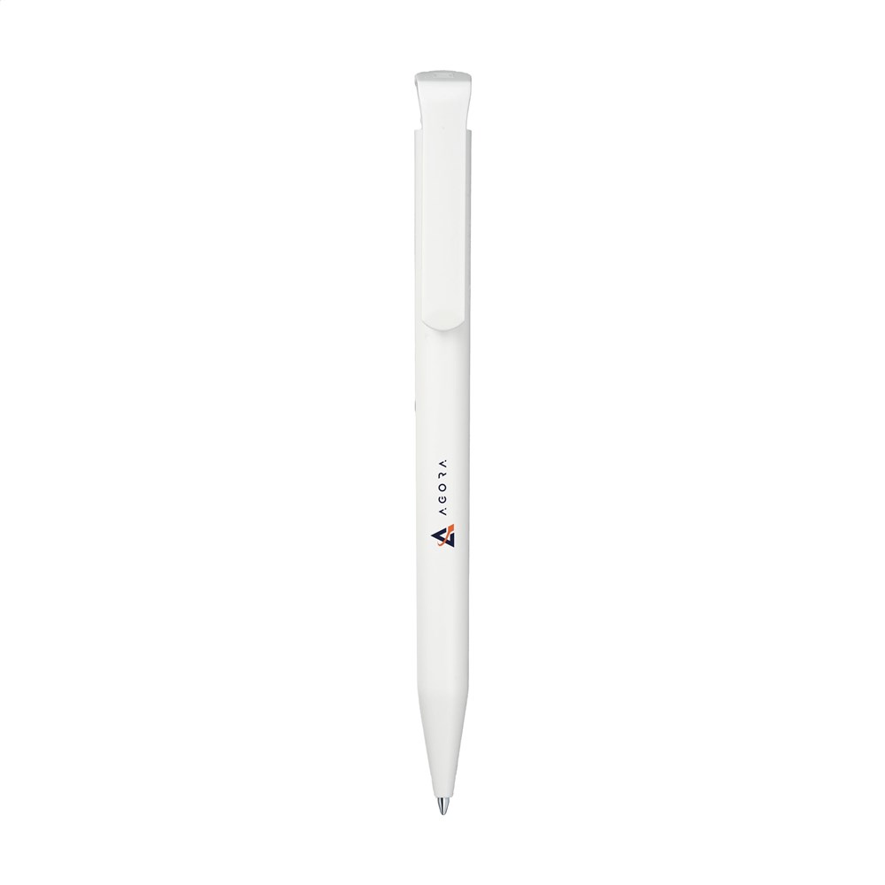 Dieser Kugelschreiber besteht aus recyceltem Kunststoff. Die Haptik ist angenehm durch die matte Textur. Der Stift wird in Deutschland produziert (Made in Germany). Die Mine ist blau schreibend und leicht austauschbar. Auf dem Schaft befindet sich standardmäßig das dezente „recycled material“ Logo. Geringfügige Oberflächenunregelmäßigkeiten sind materialbedingt und typisch für Recyclingprodukte. Du wählst zwischen Farben wie Weiß, Schwarz, Rot oder Dunkelblau.
