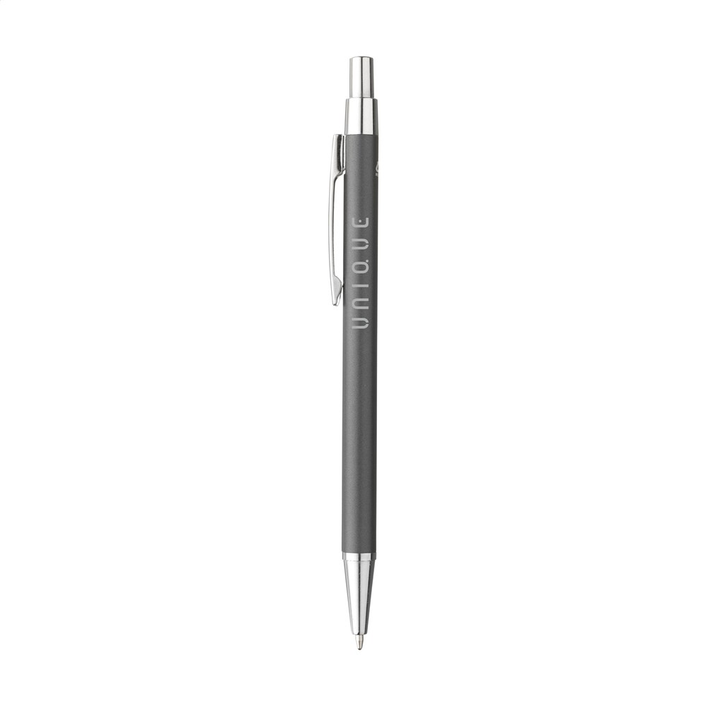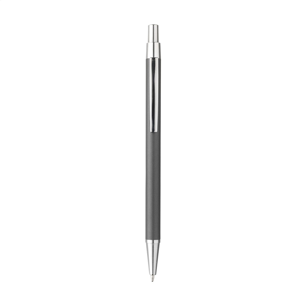 Dieser Aluminium-Kugelschreiber ist ein nachhaltiges Schreibgerät für dein Unternehmen. Der Schaft besteht zu 85 % aus zertifiziertem, recyceltem Aluminiumschrott. Du nutzt ein Produkt, das Ressourcen schont und den Energieverbrauch bei der Herstellung reduziert. Der Stift schreibt blau und besitzt ein schlankes Design. Er ist in den Farben Schwarz, Grau, Silber und Blau erhältlich.