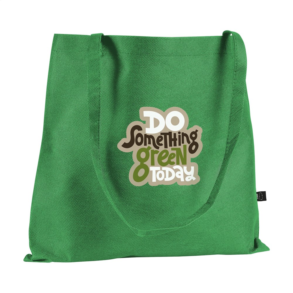 Die GRS RPET Shopper-Tasche ist eine umweltfreundliche Tragetasche aus recyceltem Non-Woven-Polyester. Das Material hat eine Qualität von 80 g/m². Diese Tasche besteht zu 97 % aus recyceltem Material. Das Produkt ist nach dem Global Recycled Standard zertifiziert. Die Tasche bietet ein Fassungsvermögen von etwa 8 Litern. Du kannst diesen Shopper mit deinem eigenen Logo bedrucken lassen.