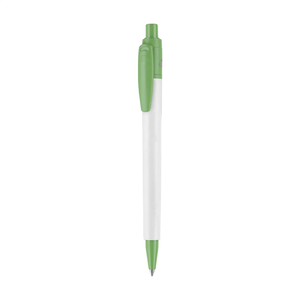 Dieser Kugelschreiber besteht aus recyceltem ABS-Kunststoff. Er verfügt über eine blau schreibende Mine. Der Stift ist in verschiedenen Gehäusefarben erhältlich. Dazu gehören Weiß, Schwarz, Grau, Blau und Hellgrün. Der Korpus ist robust und langlebig. Das Design ist klassisch und zeitlos. Die integrierte Mechanik sorgt für eine einfache Bedienung.