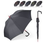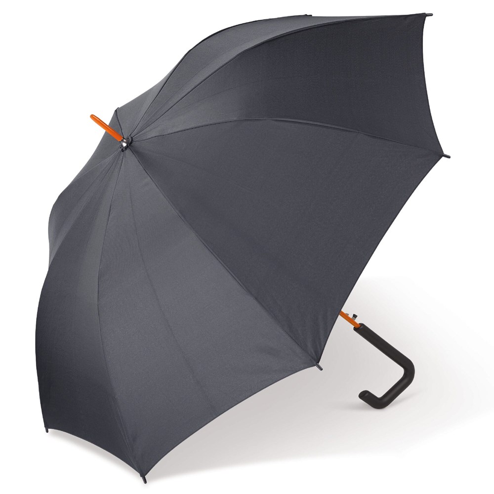Der Bezug des Schirms besteht aus robustem Pongee-Polyester. Die Speichen sind aus stabilem Fiberglas gefertigt. Das Gestell ist dadurch besonders windstabil. Die Größe beträgt 23 Zoll. Der Stockschirm öffnet sich komfortabel und schnell per Knopfdruck. Er ist in den Farben Rot, Grau, Orange, Blau und Hellgrün lieferbar.
