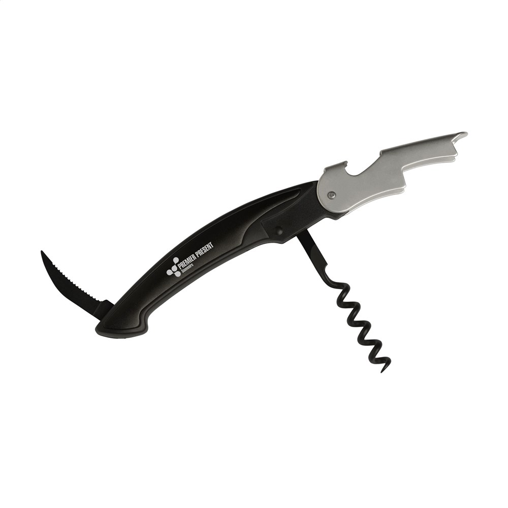 Das Produkt besteht aus rostfreiem Edelstahl und robusten Elementen aus Aluminium. Du wählst bei diesem Modell zwischen den Farben Schwarz und Blau. Das Messer verfügt über eine ausklappbare Spirale für Korken und einen integrierten Flaschenöffner. Ein kleiner Kapselschneider ist für das saubere Entfernen von Folien vorhanden. Jedes Kellnermesser wird einzeln verpackt geliefert.