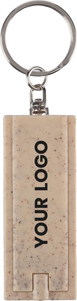 Der Schlüsselanhänger besteht aus einem Material, welches Weizenstroh enthält. Die Aktivierung des einzelnen LED-Lichts erfolgt über einen integrierten Druckknopf. Ein stabiler Metallring dient zur sicheren Befestigung am Schlüsselbund. Jeder Schlüsselanhänger wird einzeln in einem recycelten Polybeutel verpackt. Die Farbe ist Braun.