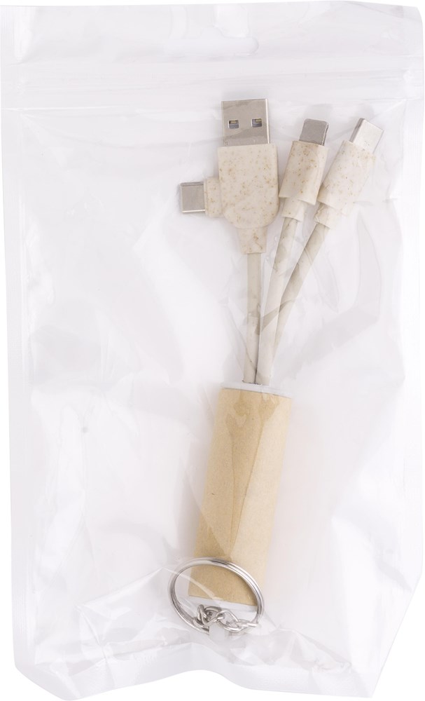 Der Schlüsselanhänger beinhaltet ein 3-in-1 Ladekabel. Die Anschlüsse sind USB-C, Micro-USB und Lightning. Das Design integriert Elemente aus Papier für eine natürliche Haptik. Das Produkt wird einzeln verpackt geliefert. Die Verpackung besteht aus einem braunen Karton. Bitte beachte die geltende Mindestabnahmemenge für bedruckte Artikel.