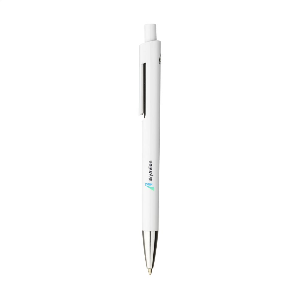Das Gehäuse besteht vollständig aus recyceltem ABS-Material. Der Stift ist in den Farben Schwarz, Rot, Orange, Gelb, Dunkelblau, Hellblau und Grün verfügbar. Er schreibt mit blauer Tinte. Die GRS-Zertifizierung bestätigt die Herkunft der recycelten Komponenten. Das Design zeichnet sich durch die fließende Verbindung von Body und Clip aus.